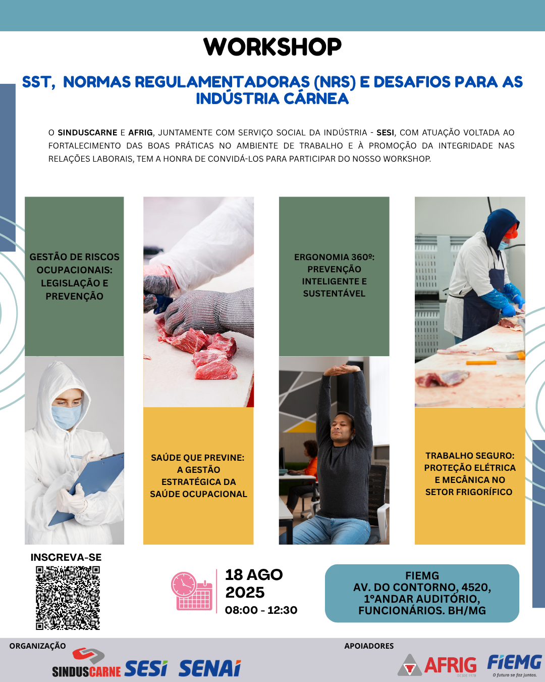 O Sinduscarne convida sua equipe para participar no próximo dia 02 de julho, do Workshop exclusivo voltado à Indústria de Carnes, com foco em inovação e qualidade.